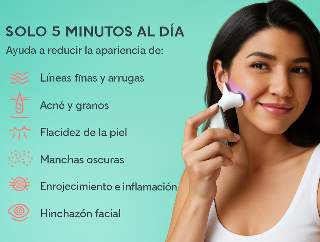 La luz azul combate las bacterias del acné, reduce la inflamación y deja la piel más limpia. El calor suave alivia la irritación y previene nuevos brotes, garantizando un brillo calmado.